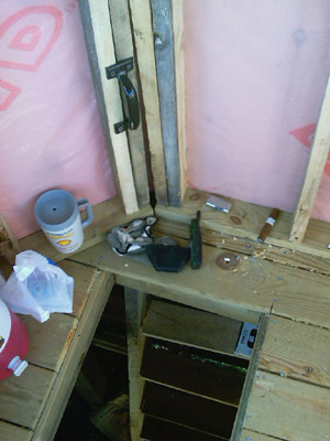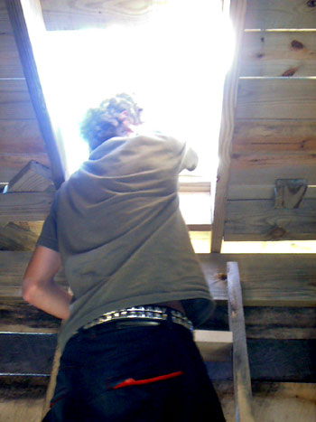 With the additional headroom from the vaulted ceiling, there's just enough room to stand up and bang your head into the ceiling braces. Trevor is on the left, Kevin on the right. |
