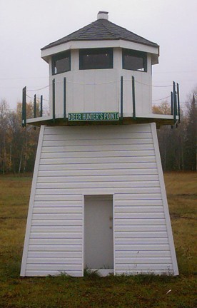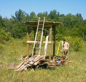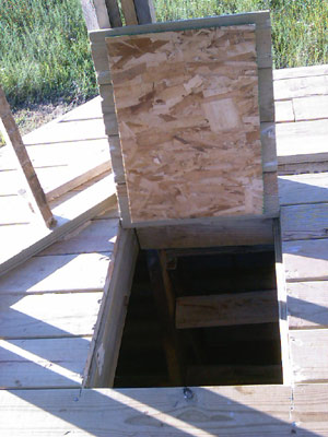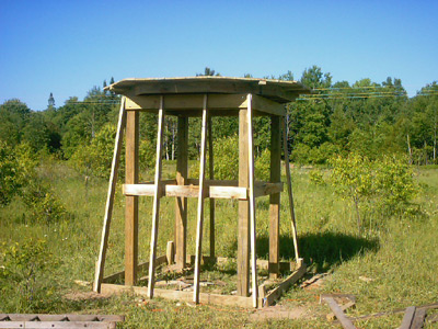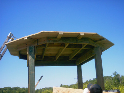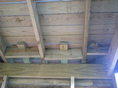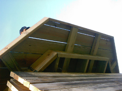 Notice the braces that give support to the decking that extends past the 6' x 6' main structure. You will need these later as the walkway around the upper portion of the blind is critical for building the roof. |